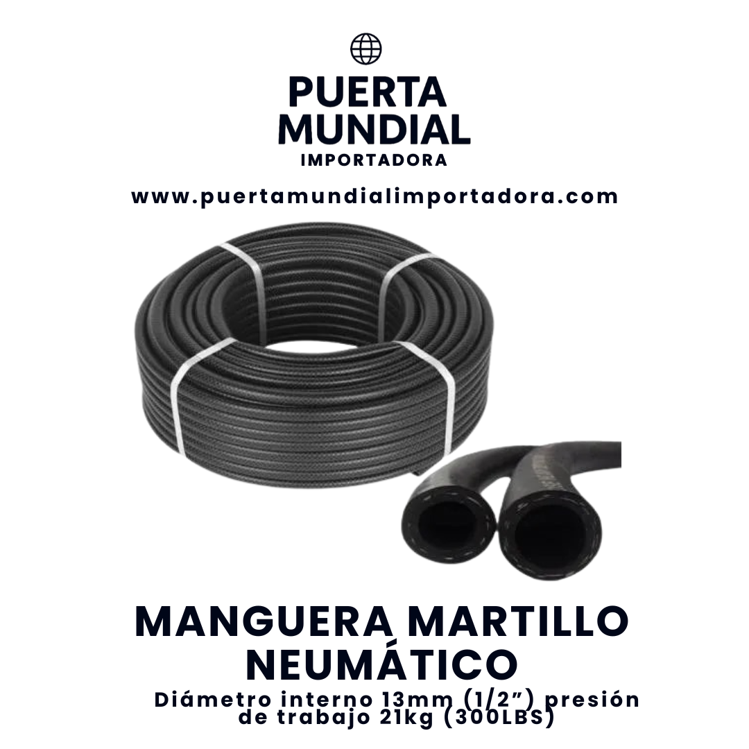 La Manguera para Martillo Neumático de 13mm (1/2”) es una solución confiable y resistente diseñada para soportar las exigencias de herramientas neumáticas, especialmente martillos neumáticos. Fabricada en PVC con refuerzo textil, esta manguera está formulada para resistir picos de presión intermitentes, asegurando un rendimiento óptimo y duradero en el trabajo.