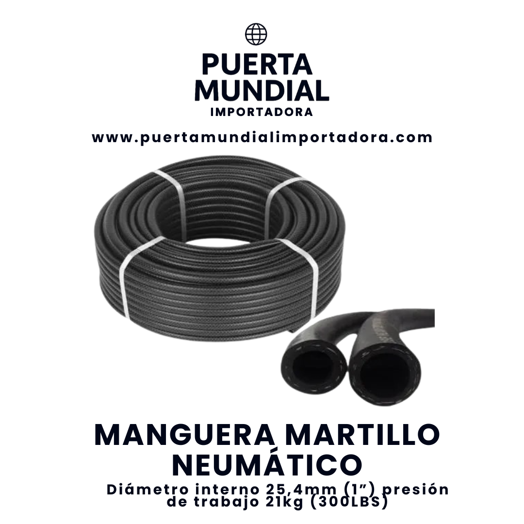 La Manguera para Martillo Neumático de 25,4mm (1”) es una solución confiable y resistente diseñada para soportar las exigencias de herramientas neumáticas, especialmente martillos neumáticos. Fabricada en PVC con refuerzo textil, esta manguera está formulada para resistir picos de presión intermitentes, asegurando un rendimiento óptimo y duradero en el trabajo.